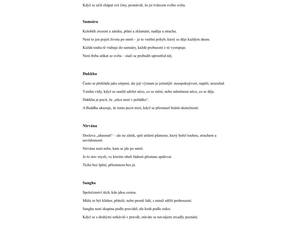 Zachytit hlavní proud učení – to, co prochází celou Dhammapadou jako neviditelná řeka: poznání mysli, přeměna srdce a návrat do ticha.