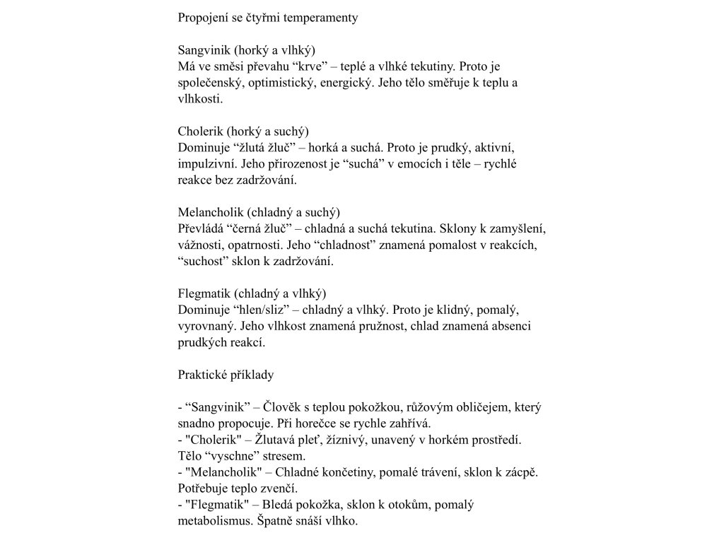 Text vám ukáže, jaké měl Galén představy o příčinách jednotlivých temperamentů – jak věřil, že sangvinik má převahu teplé a vlhké krve, cholerik horké a suché žluté žluči, melancholik studené a suché černé žluči, flegmatik pak studeného a vlhkého hlenu. Pro nás dnes může znít humorální medicína archaicky, ale principy, které Galén objevil – že tělesná konstituce ovlivňuje psychiku, že existují různé “typy” lidí s odlišnými reakcemi – tyto myšlenky přežívají v moderní medicíně dodnes.